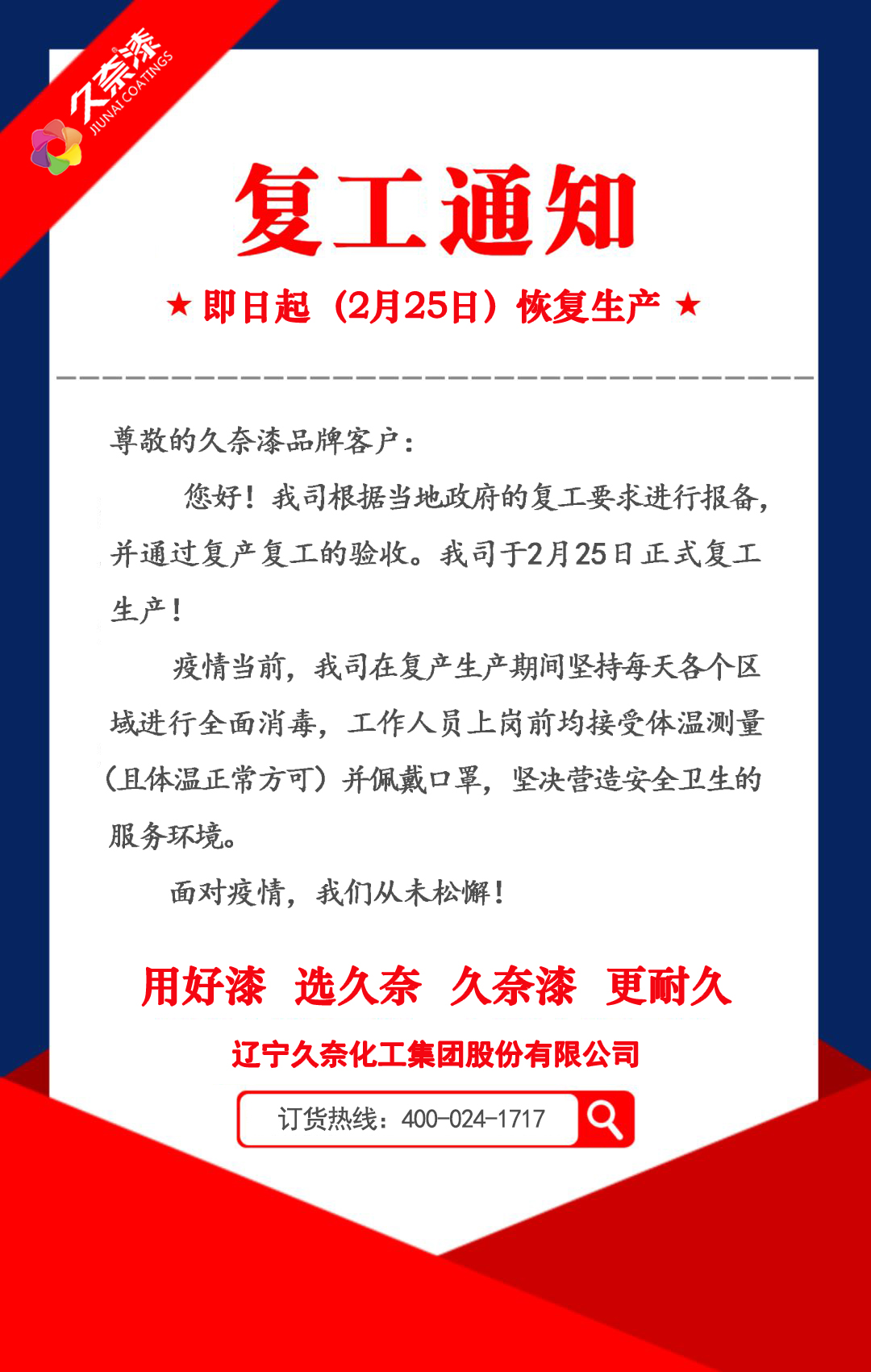 遼寧久奈化工集團(tuán)股份有限公司復(fù)工通知