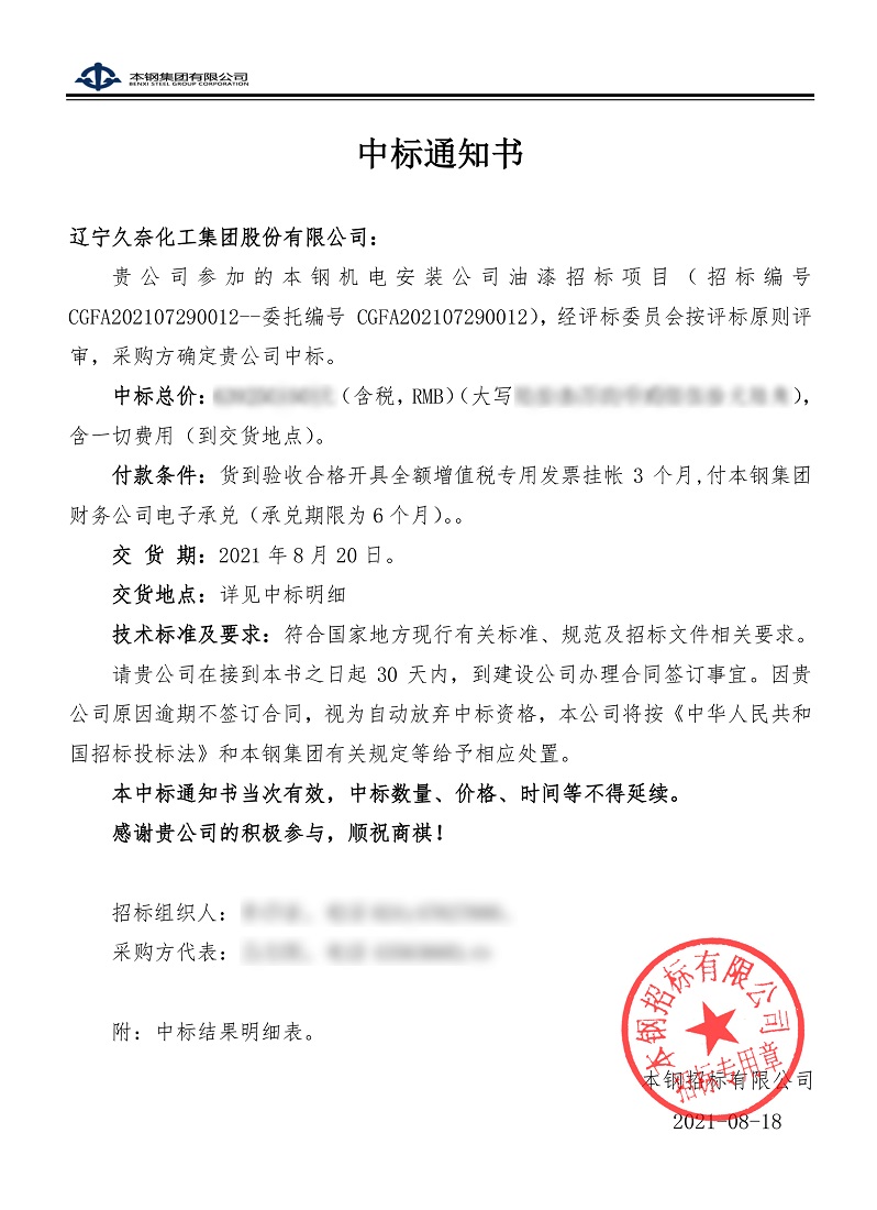 2021年8月18日,遼寧久奈化工集團(tuán)股份有限公司(以下簡(jiǎn)稱遼寧久奈化工)收到本鋼集團(tuán)有限公司出具的《中標(biāo)通知書》,本鋼機(jī)電安裝公司油漆招標(biāo)項(xiàng)目。